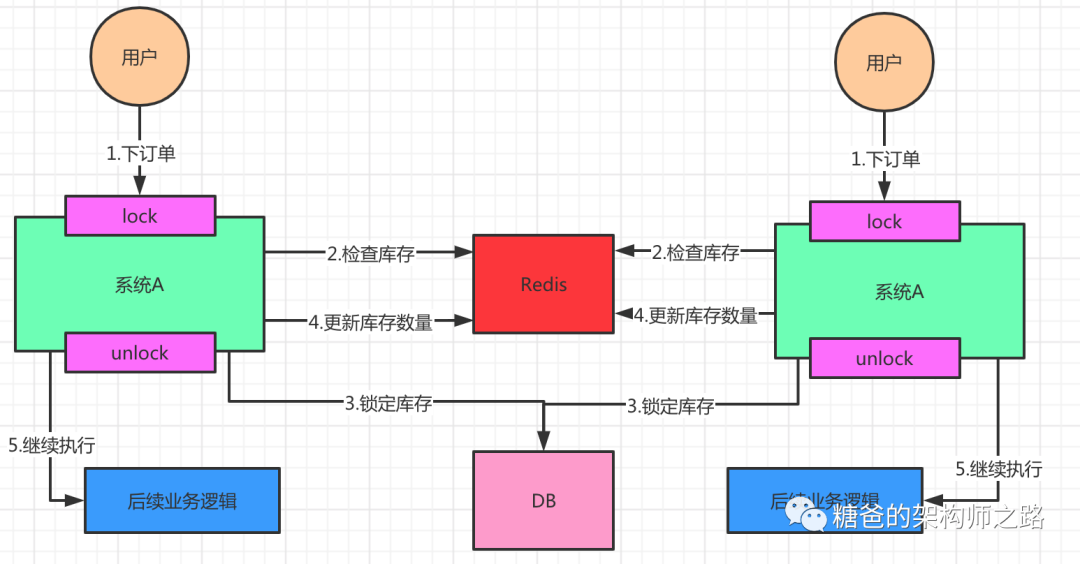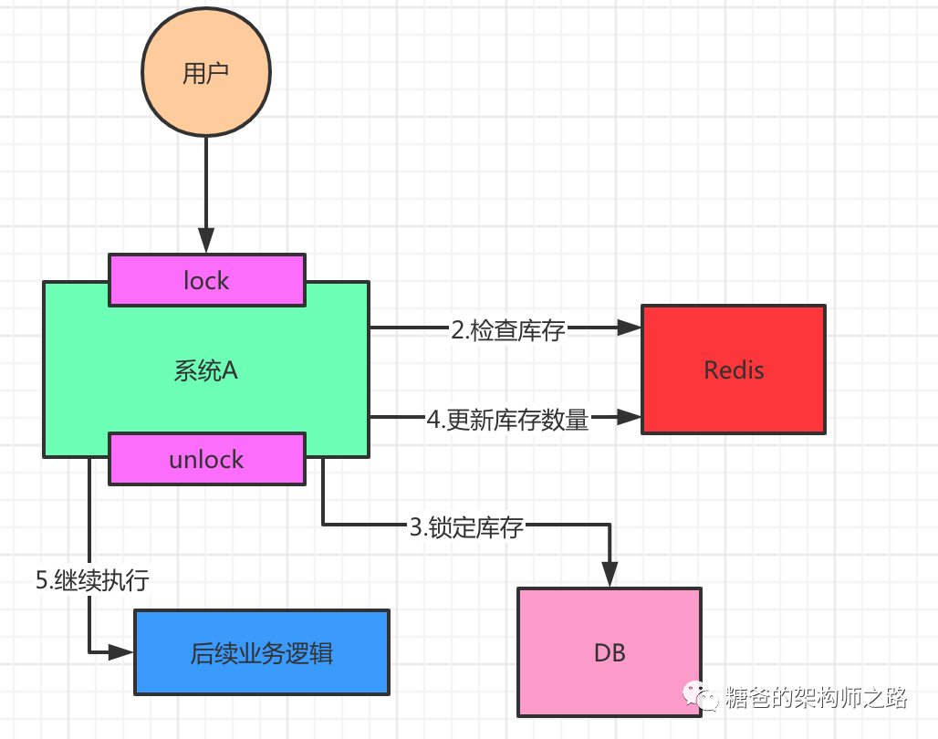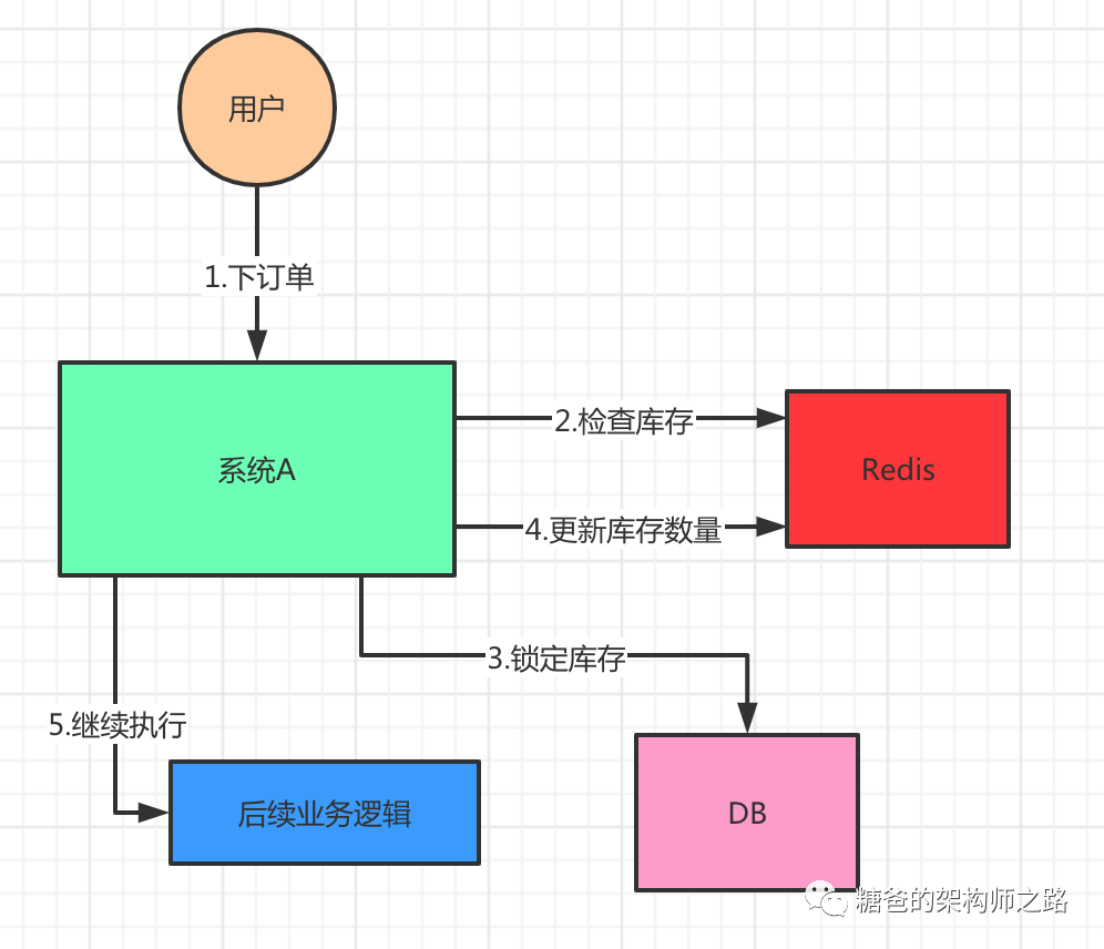 首先我们来看下面的业务场景,系统A是一个电商系统,目前是一台机器部署,系统中有一个用户下订单的接口,但是用户下订单之前一定要去检查一下库存,确保库存足够了才会给用户下单。由于系统有一定的并发,所以会预先将商品的库存保存在Redis中,用户下单的时候会更新Redis的库存。如下图: