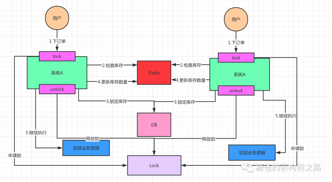 假设此时两个用户的请求同时到来,但是落在了不同的机器上,那么这两个请求是可以同时执行了,还是会出现库存超卖的问题。因为上图中的两个A系统,运行在两个不同的JVM里面,他们加的锁只对属于自己JVM里面的线程有效,对于其他JVM的线程是无效的。因此,这里的问题是:Java提供的原生锁机制在多机部署场景下失效了,这是因为两台机器加的锁不是同一个锁(两个锁在不同的JVM里面)。那么,我们只要保证两台机器加的锁是同一个锁,问题不就解决了吗?此时,就该分布式锁隆重登场了,如下图: