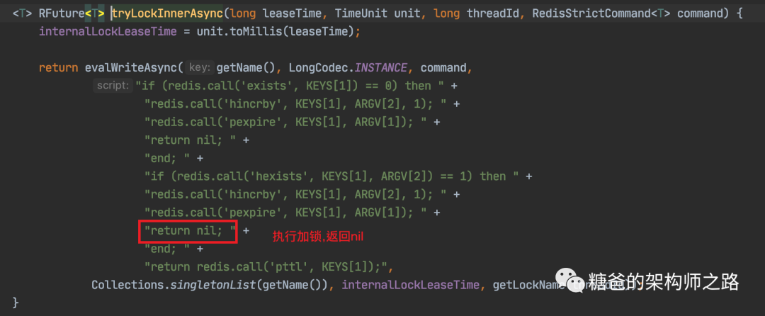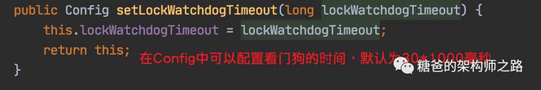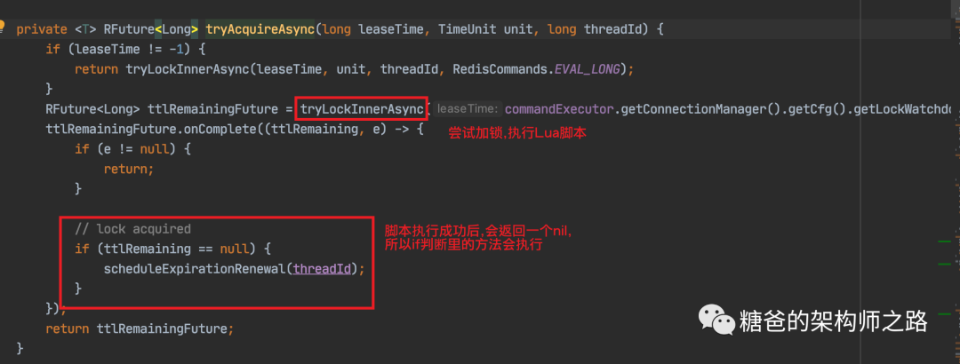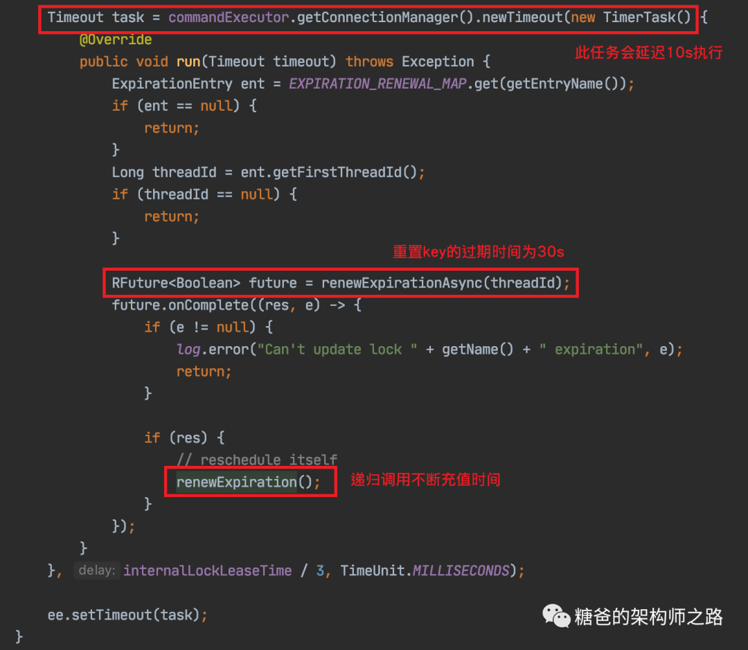 RedissonLock.renewExpiration()方法如果调用失败会打一个错误日志并返回,更新锁过期时间失败,然后获取异步执行的结果,如果为true,就会调用本身,如此说来又会延迟10秒钟去执行这段逻辑,所以,这段逻辑在你成功获取到锁之后,会每隔十秒钟去执行一次,并且,在锁key还没有失效的情况下,会把锁的过期时间继续延长到30000毫秒,也就是说只要这台服务实例没有挂掉,并且没有主动释放锁,看门狗都会每隔十秒给你续约一下,保证锁一直在你手中。