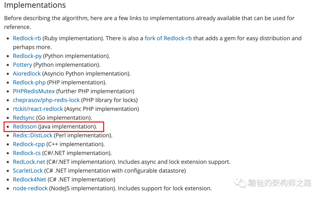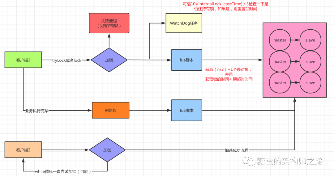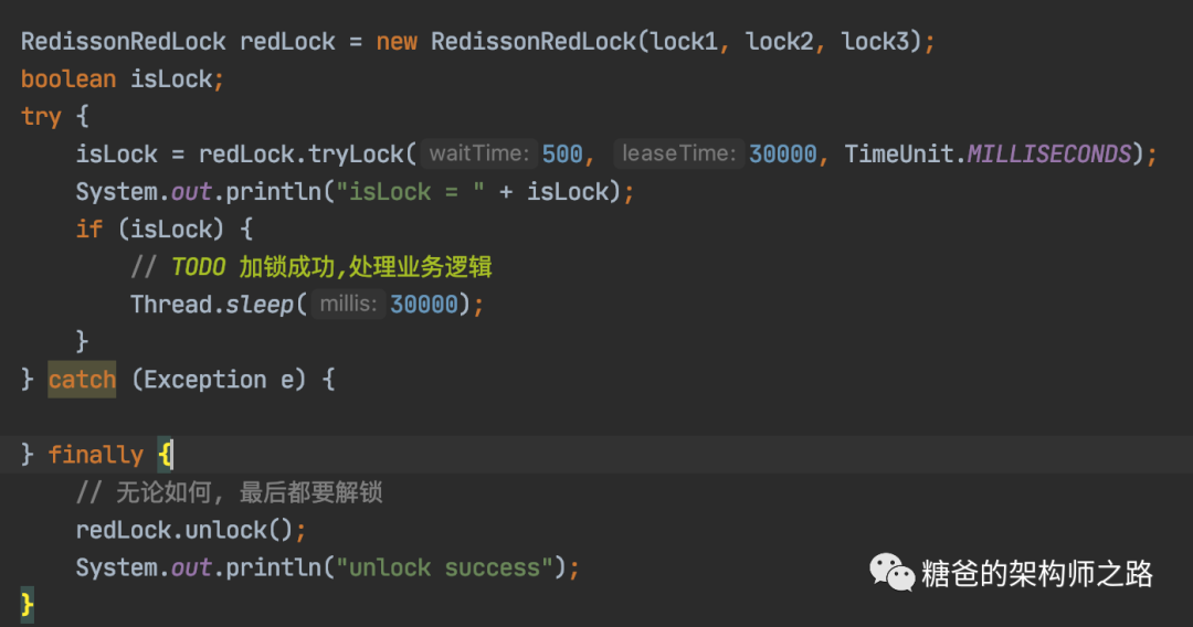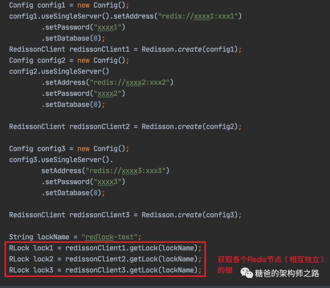 RLock lock1 = redissonInstance1.getLock("lock1");RLock lock2 = redissonInstance2.getLock("lock2");RLock lock3 = redissonInstance3.getLock("lock3");RedissonMultiLock lock = new RedissonMultiLock(lock1, lock2, lock3);// 同时加锁:lock1 lock2 lock3// 所有的锁都上锁成功才算成功。lock.lock();...lock.unlock();