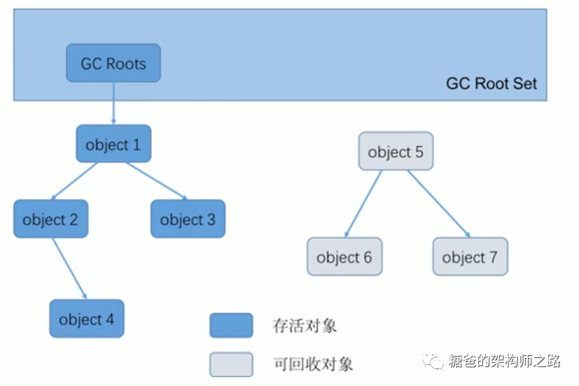 存活对象:在可达性分析算法中,只有能够被根对象集合直接或者间接连接的对象才是存活对象。