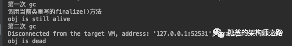 finalize()方法是对象逃亡的最后机会,稍后GC会对F-Queue队列中的对象进行第二次标记。如果objA在finalize()方法中与引用链上的任何一个对象建立联系,那么在第二次标记时objA会被移除"即将回收"集合。之后对象会再次出现没有引用存在的情况。在这个情况下,finalize()方法不会再次被调用,对象会直接变成不可触及的状态。也就是说,一个对象的finalize()方法只会被调用一次。