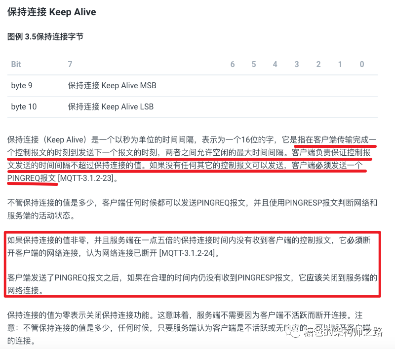 简单来说,就是在创建连接时发送的CONNECT控制报文中,在第九和第十字节会携带客户端与服务端的最大连接时长,如果超过这个时间,服务端和客户端会各自做一些相应的处理。但是这样会有一个问题,当客户端在超过最大连接时长的时间段内确实没有消息上送至服务器,此时服务器是无法判断因为客户端出现故障导致的还是确实没有收到消息导致的。所以MQTT协议中规定了PINGREQ和PINGRESP两种控制类型的报文用来处理上述情况,即如果客户端真的没有消息上送,你也要定时给我发送一个PINGREQ类型的报文告诉我你还活着,我服务器收到后会即使回送一个PINGRESP报文告诉客户端我收到了,这就是一条心跳消息。