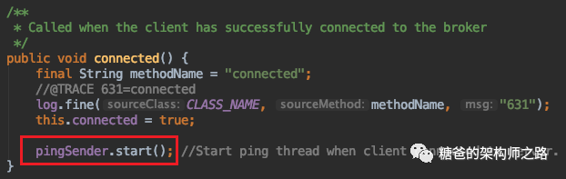 protected void notifyReceivedAck(MqttAck ack) throws MqttException {if (token == null) {...} else if (ack instanceof MqttPubRec) {...} else if (ack instanceof MqttPubAck || ack instanceof MqttPubComp) {...} else if (ack instanceof MqttPingResp) {...} else if (ack instanceof MqttConnack) {int rc = ((MqttConnack) ack).getReturnCode();if (rc == 0) {synchronized (queueLock) {if (cleanSession) {clearState();// Add the connect token back in so that users can be// notified when connect completes.tokenStore.saveToken(token,ack);}inFlightPubRels = 0;actualInFlight = 0;restoreInflightMessages();// 开启PingSenderconnected();}}...}
