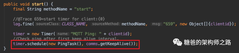 客户端与服务端建立连接后,服务端会响应一个CONNACK类型的报文,所以在消息接收线程中,如果判断是这种类型的报文,会创建Timer并开始心跳