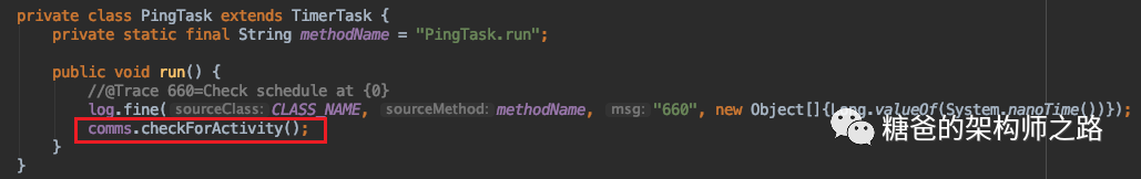 public interface MqttPingSender {/*** Initial method. Pass interal state of current client in.* @param comms The core of the client, which holds the state information for pending and in-flight messages.*/// 初始化心跳发送器void init(ClientComms comms);/*** Start ping sender. It will be called after connection is success.*/// 心跳开始void start();/*** Stop ping sender. It is called if there is any errors or connection shutdowns.*/// 心跳终止void stop();/*** Schedule next ping in certain delay.* @param delayInMilliseconds delay in milliseconds.*/// 触发下一次心跳void schedule(long delayInMilliseconds);}
