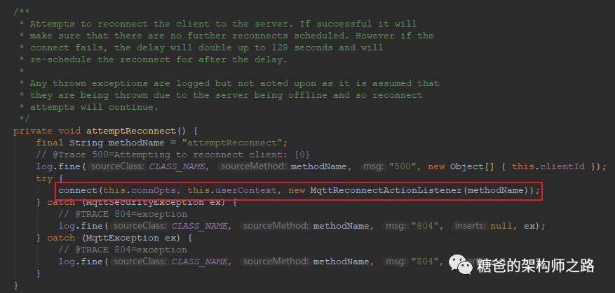 public void onFailure(IMqttToken token, Throwable exception) {int numberOfURIs = comms.getNetworkModules().length;int index = comms.getNetworkModuleIndex();// 轮询设置的其他Broker,并尝试连接if ((index + 1) < numberOfURIs || (originalMqttVersion == MqttConnectOptions.MQTT_VERSION_DEFAULT && options.getMqttVersion() == MqttConnectOptions.MQTT_VERSION_3_1_1)) {if (originalMqttVersion == MqttConnectOptions.MQTT_VERSION_DEFAULT) {if (options.getMqttVersion() == MqttConnectOptions.MQTT_VERSION_3_1_1) {options.setMqttVersion(MqttConnectOptions.MQTT_VERSION_3_1);}else {options.setMqttVersion(MqttConnectOptions.MQTT_VERSION_3_1_1);comms.setNetworkModuleIndex(index + 1);}}else {// 将游标 + 1,方便下一次直接取出地址集合的下一个元素comms.setNetworkModuleIndex(index + 1);}try {connect();}catch (MqttPersistenceException e) {// 递归调用,此时onFailure(token, e); // try the next URI in the list}}// 如果都不成功,触发回调进行下一次重连尝试操作。else {if (originalMqttVersion == MqttConnectOptions.MQTT_VERSION_DEFAULT) {options.setMqttVersion(MqttConnectOptions.MQTT_VERSION_DEFAULT);}MqttException ex;if (exception instanceof MqttException) {ex = (MqttException) exception;}else {ex = new MqttException(exception);}userToken.internalTok.markComplete(null, ex);userToken.internalTok.notifyComplete();userToken.internalTok.setClient(this.client); // fix bug 469527 - maybe should be set elsewhere?if (userCallback != null) {userToken.setUserContext(userContext);// MqttReconnectActionListener.onFailure();userCallback.onFailure(userToken, exception);}}}