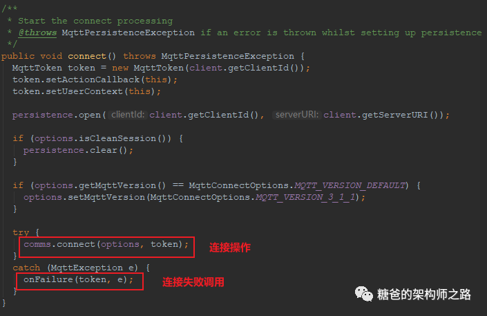 public IMqttToken connect(MqttConnectOptions options, Object userContext, IMqttActionListener callback)throws MqttException, MqttSecurityException {// 判断当前的连接状态,只有当前z状态为已断开,即isDisconnected// 才会继续执行final String methodName = "connect";if (comms.isConnected()) {throw ExceptionHelper.createMqttException(MqttException.REASON_CODE_CLIENT_CONNECTED);}if (comms.isConnecting()) {throw new MqttException(MqttException.REASON_CODE_CONNECT_IN_PROGRESS);}if (comms.isDisconnecting()) {throw new MqttException(MqttException.REASON_CODE_CLIENT_DISCONNECTING);}if (comms.isClosed()) {throw new MqttException(MqttException.REASON_CODE_CLIENT_CLOSED);}if (options == null) {options = new MqttConnectOptions();}this.connOpts = options;this.userContext = userContext;// 设置网络资源以及连接属性final boolean automaticReconnect = options.isAutomaticReconnect();new Object[] { Boolean.valueOf(options.isCleanSession()), Integer.valueOf(options.getConnectionTimeout()),Integer.valueOf(options.getKeepAliveInterval()), options.getUserName(),((null == options.getPassword()) ? "[null]" : "[notnull]"),((null == options.getWillMessage()) ? "[null]" : "[notnull]"), userContext, callback });comms.setNetworkModules(createNetworkModules(serverURI, options));// 设置重连回调comms.setReconnectCallback(new MqttReconnectCallback(automaticReconnect));MqttToken userToken = new MqttToken(getClientId());// 设置连接监听器ConnectActionListener connectActionListener = new ConnectActionListener(this, persistence, comms, options,userToken, userContext, callback, reconnecting);userToken.setActionCallback(connectActionListener);userToken.setUserContext(this);if (this.mqttCallback instanceof MqttCallbackExtended) {connectActionListener.setMqttCallbackExtended((MqttCallbackExtended) this.mqttCallback);}comms.setNetworkModuleIndex(0);// 触发连接connectActionListener.connect();return userToken;}