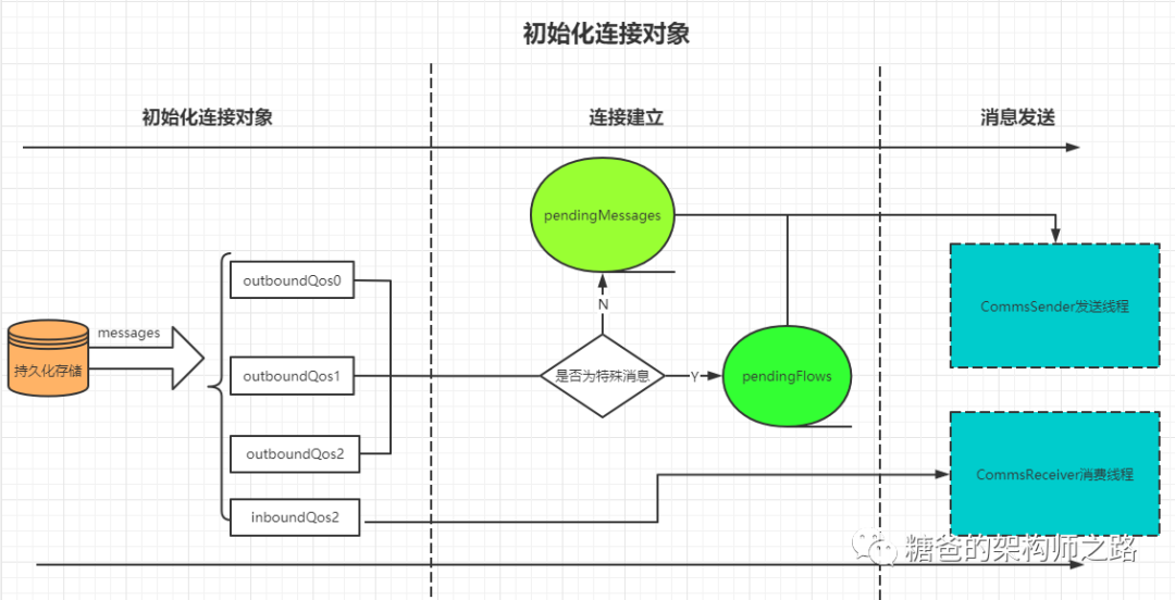 在初始化连接对象阶段,会将消息从持久化存储恢复到出站队列