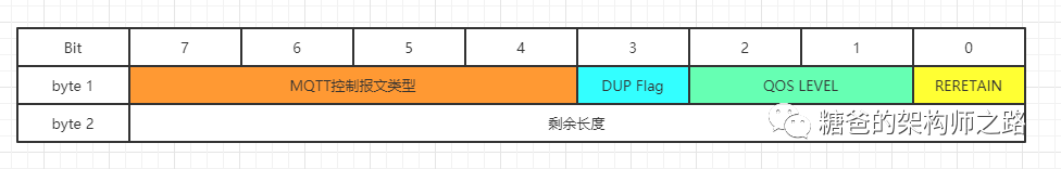 每个MQTT控制报文都包含一个固定报头,固定头部占用两个字节。其内存结构大概如下图所示