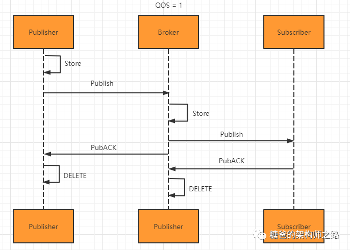 QOS= 1:确保消息到达,但消息重复可能会发生。当broker收到client的publisher或者subscriber收到broker的publisher时,都会产生一条puback用来确认到达。当client没收到broker的puback或者broker没有收到client的puback,name就会一直发送publisher