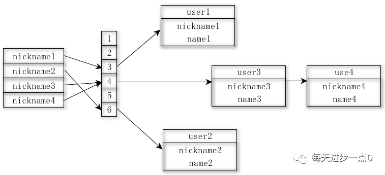 示意图中,user3和user4根据nickname字段算出来的位置都是4,所以在4位置用了一个链表表示,当我们在查询的时候,比如我们根据nickname4查询,查询步骤就是:先使用哈希函数计算nickname3得到4,然后遍历链表直到找到user4。