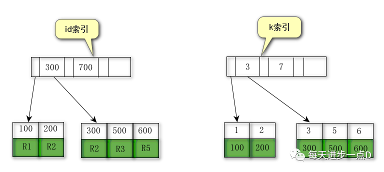 表中 R1~R5 的 (ID,k) 值分别为 (100,1)、(200,2)、(300,3)、(500,5) 和 (600,6),两棵树的示例示意图如下: