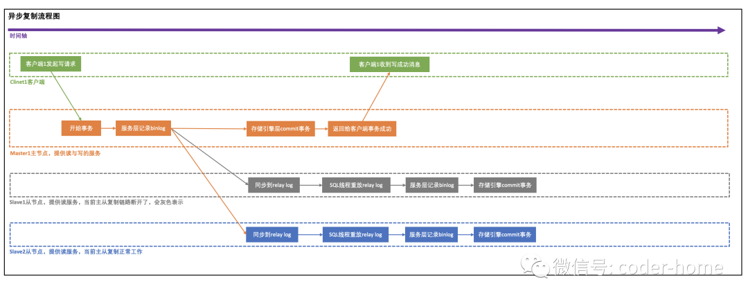 异步复制是搭建好MySQL主从复制集群后,默认使用的复制方式。这个复制的流程图如下,供你参考: