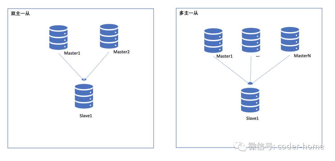 只限于单源复制,不支持多源复制,也就是只支持一主一从,一主多从,双主多从(主主互为主备)这样的网络拓扑架构,不支持多主一从的网络拓扑架构。不支持如下网络拓扑架构。