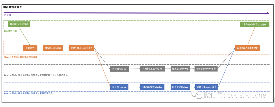 同步复制是最安全的一种复制方式,但是效率也是最低的一种模式。它的复制流程图如下所示,这也是另外中MySQL高可用集群的实现方式之一:MGR高可用集群,基于组的复制。以后再展开说一下这个这种复制方式。