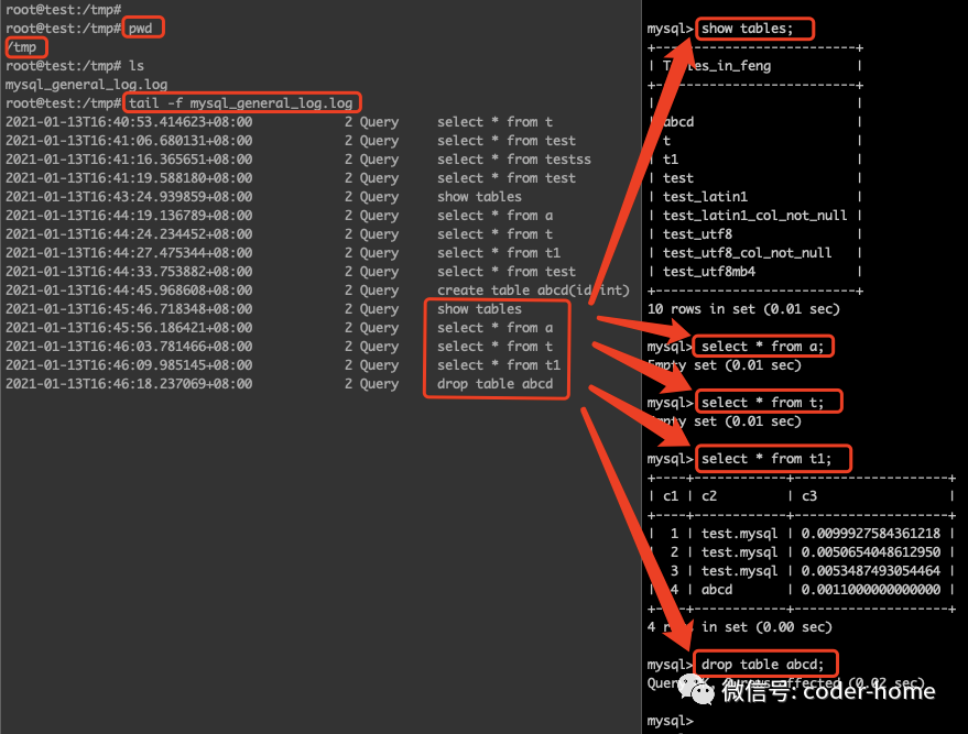 接下来,我们来执行一些SQL,看下日志是否可以正常记录在/tmp/mysql_general_log.log