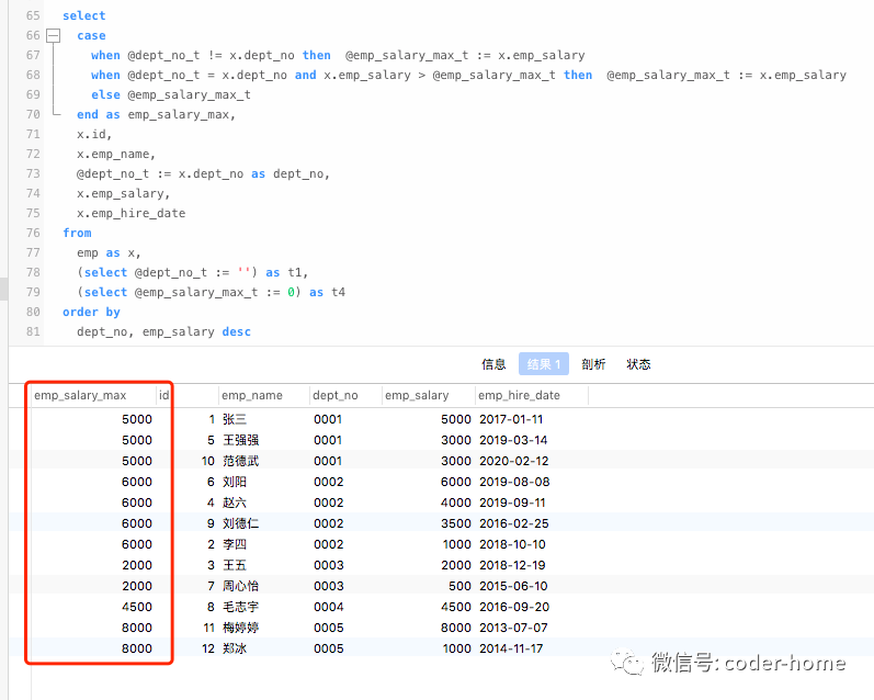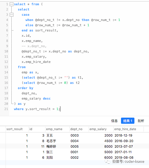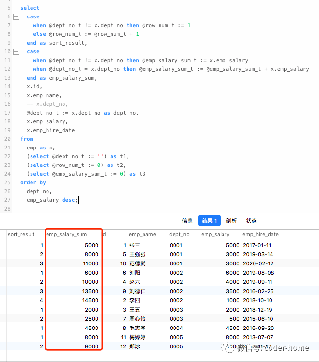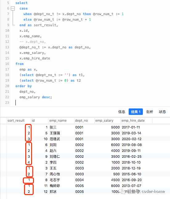 用于存储判断数据行是否是同一组。同事给他们分别初始化数据。然后再查询的字段当中,先判断一下当前是否和上一行的部门编号是同一个部门编号。如果是同一个部门编号,则将排序结果字段加1;如果不是同个部门编号,表示要切换为新的组了,这个时候,把排序结果字段重置为1。select