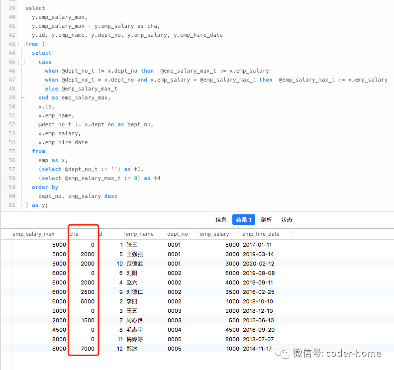 基于步骤1的结果集中的新列,和员工的工资列做减法得到差值。