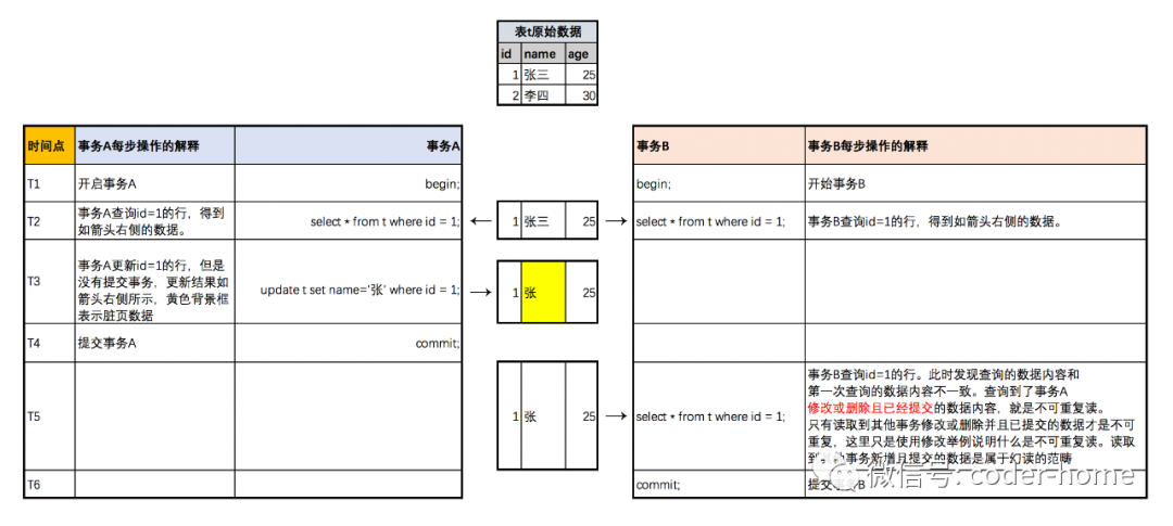 不可重复读是指一个事务在执行过中,前后读取到的数据不一致,是因为读取到其它事务update