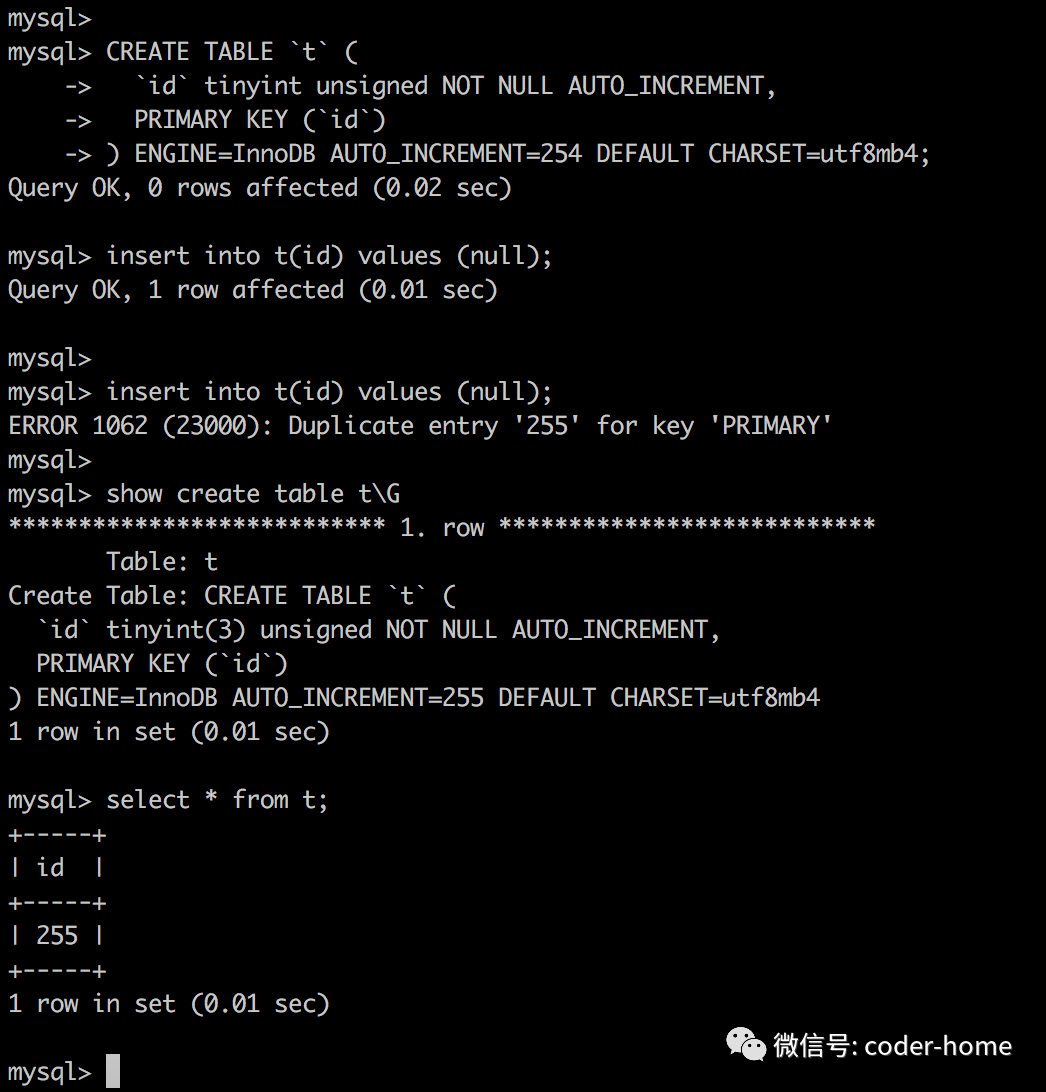 如果一张表的自增ID用完之后,我们再次向这个表中插入数据会怎么样呢?我们使用tinyint类型的自增主键举例举例来实验一下。
