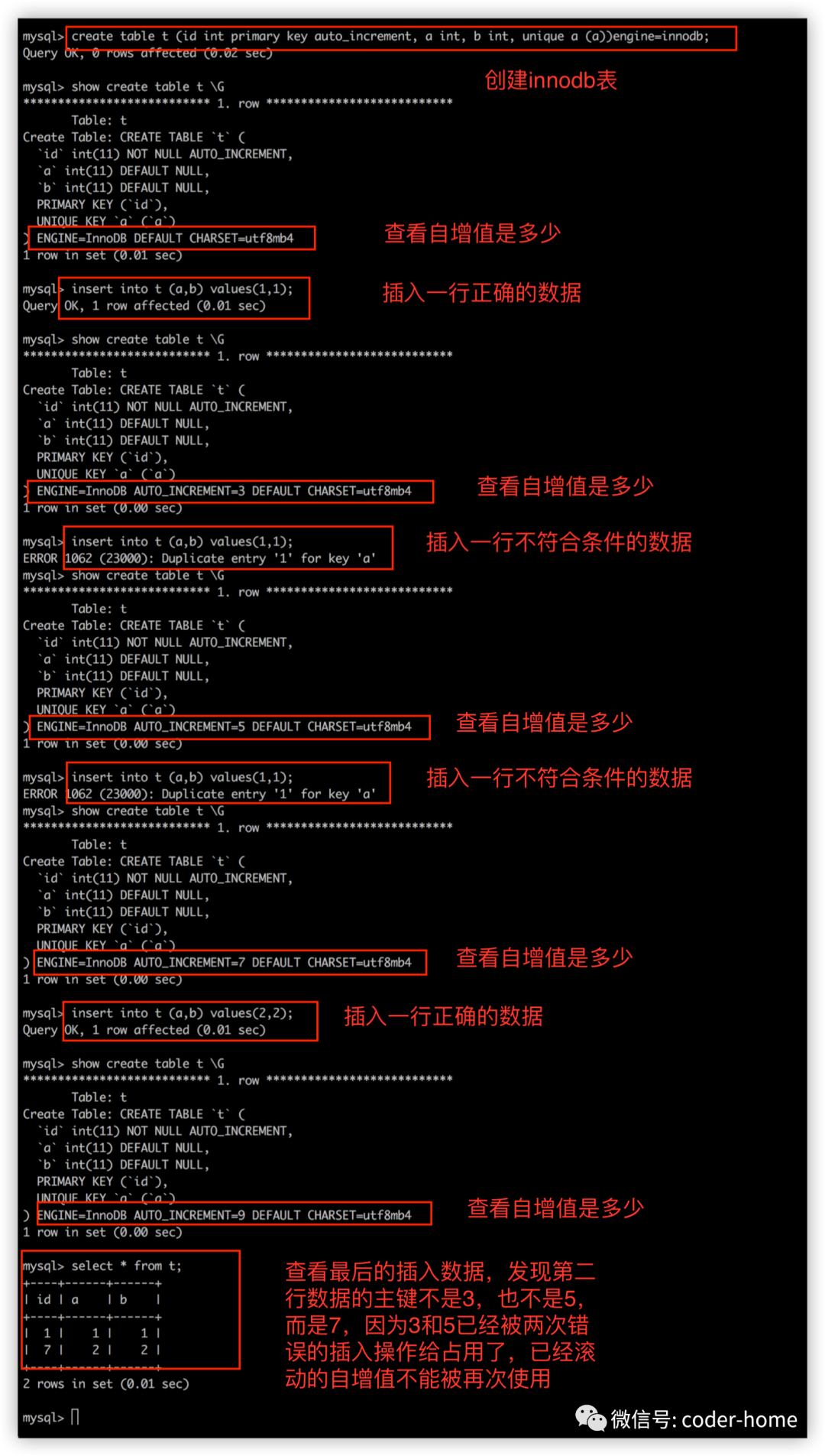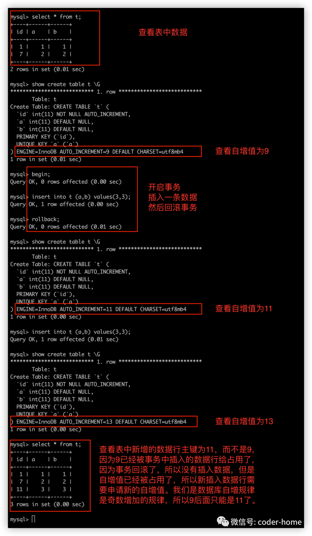 注意:这里的失败不是指普通插入数据失败。例如:列值和列类型不匹配、列值大小或长度超过列的定义范围、列数目和表定义的数目不匹配,这些错误导致插入数据失败的时候,表的自增值不会被滚动加1。所以,我们不能一刀切的认为凡是插入数据失败了,那么这个表中的自增主键的自增值就会向后滚动加1。