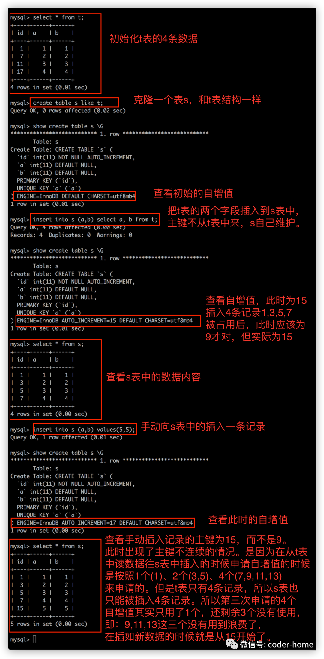 手动向s表中插入一条记录,看下这条记录的主键值是多少。此时发现新插入记录的主键值和上面的4条记录不是连续的。原因就是上面描述的那样,在批量插入未知记录数到表中的时候,每次申请的自增值的个数是上一次的申请个数的2倍。而如果申请2倍之后,刚插入了几条发现没有数据可以插入了,此时申请的自增值就浪费掉了。