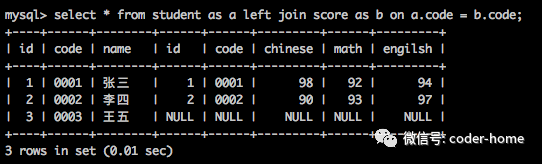 省略。简写为left joinleft左边的表为主表,left右边的表为从表。返回结果行数以left左边的表的行数为最后的数据行,对于左表中有些数据行在右表中找不到它所匹配的数据行记录时候,返回结果的时候这些行后面通常会以