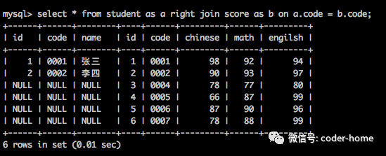 省略。简写为right joinright右边的表为主表,right坐标的表为从表。返回结果行数以right右边的表的行数为左后的数据行,对于主表中有些数据行在从表中找不到它所匹配的数据行记录时候,返回结果的时候这些行后面通常会以