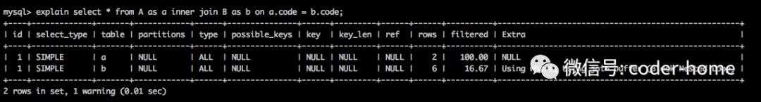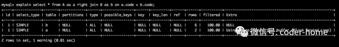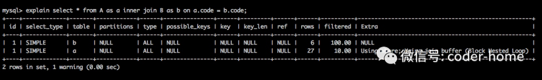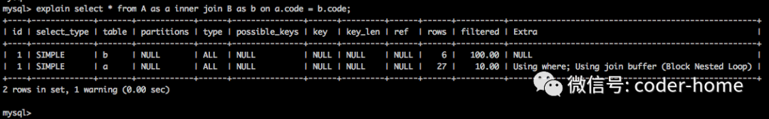因为在被驱动表A找那个没有索引,所以MySQL此时才去的关联方式是基于块的嵌套循环连接。执行计划如下所示: