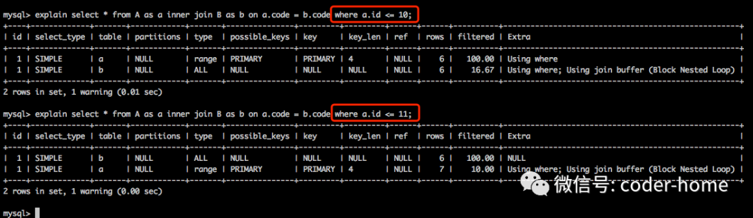 执行计划如下,从中可以看出B表示驱动表,A表示被驱动表。