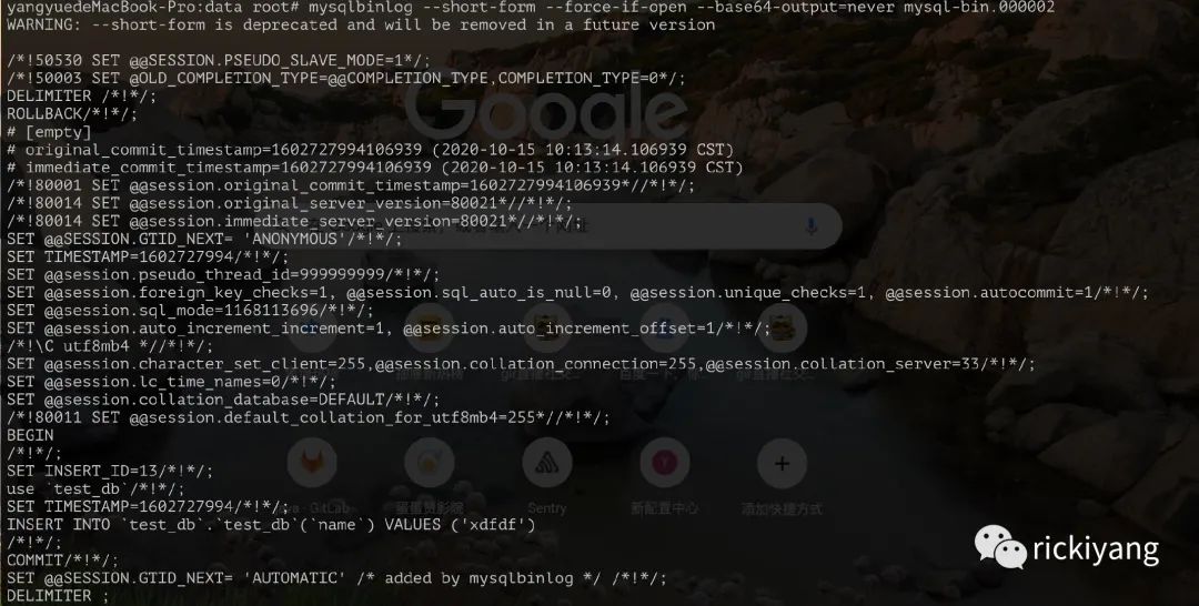 Binlog 文件是二进制文件,强行打开看到的必然是乱码,MySQL 提供了命令行的方式来展示 Binlog 日志: