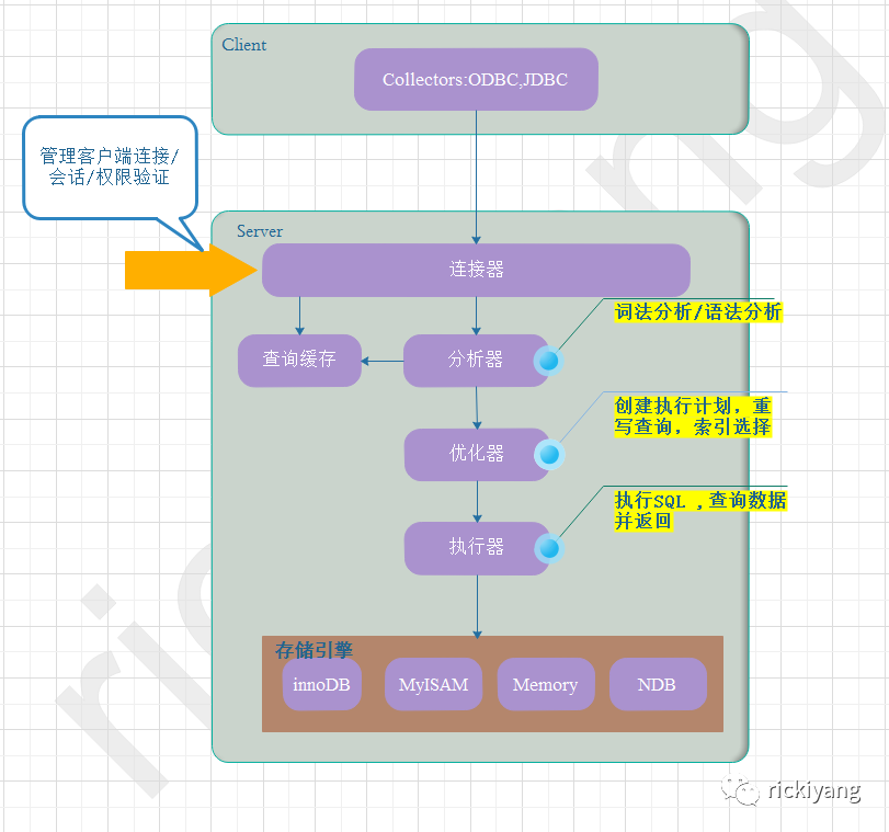 这条 SQL 是如何从你的应用程序到达 MYSQL 服务器并执行,然后查到结果再带给你的呢?要回答这个问题我们看一下 MYSQL 的整体架构: