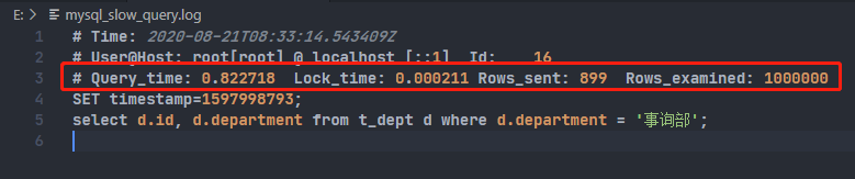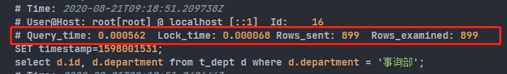 从慢日志中可以看到上面说到的主要指标:查询事件、返回行数、扫描行数