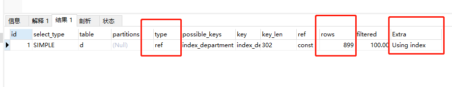 可以看到访问类型已经从全表扫描ALL变成了非唯一性索引扫描ref,预计访问行数由97万行变成了899行,Extra显示了WHERE条件使用了索引覆盖扫描。