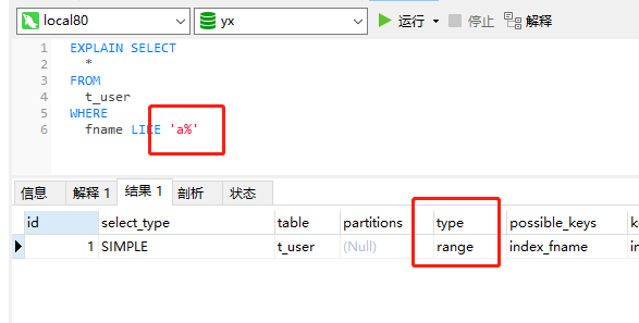 问题来了,返回行数899行,却扫描了整个表100万条数据,当然效率低下了,明显用到了全表扫描,EXPLAIN执行计划中的type列说明了访问类型。执行看一下: