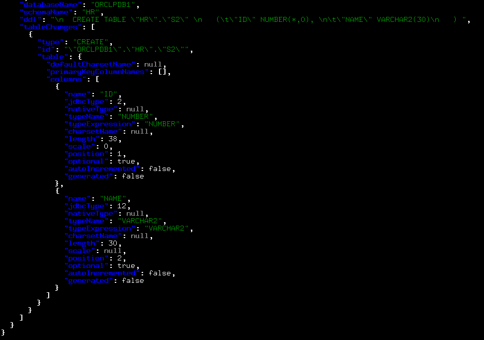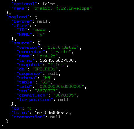 [2021-06-24 22:47:23,125] INFO WorkerSourceTask{id=testoracledb-0} Source task finished initialization and start (org.apache.kafka.connect.runtime.WorkerSourceTask:225)[2021-06-24 22:47:23,132] INFO Metrics registered (io.debezium.pipeline.ChangeEventSourceCoordinator:99)[2021-06-24 22:47:23,132] INFO Context created (io.debezium.pipeline.ChangeEventSourceCoordinator:102)[2021-06-24 22:47:23,186] INFO Snapshot step 1 - Preparing (io.debezium.relational.RelationalSnapshotChangeEventSource:94)[2021-06-24 22:47:23,186] INFO Previous snapshot was cancelled before completion; a new snapshot will be taken. (io.debezium.relational.RelationalSnapshotChangeEventSource:97)[2021-06-24 22:47:23,187] INFO Snapshot step 2 - Determining captured tables (io.debezium.relational.RelationalSnapshotChangeEventSource:103)[2021-06-24 22:47:23,456] INFO Snapshot step 3 - Locking captured tables [ORCLPDB1.HR.S2] (io.debezium.relational.RelationalSnapshotChangeEventSource:110)[2021-06-24 22:47:23,463] INFO Snapshot step 4 - Determining snapshot offset (io.debezium.relational.RelationalSnapshotChangeEventSource:116)[2021-06-24 22:47:23,587] INFO Snapshot step 5 - Reading structure of captured tables (io.debezium.relational.RelationalSnapshotChangeEventSource:119)[2021-06-24 22:47:24,321] INFO Snapshot step 6 - Persisting schema history (io.debezium.relational.RelationalSnapshotChangeEventSource:123)[2021-06-24 22:47:26,698] INFO Already applied 2 database changes (io.debezium.relational.history.DatabaseHistoryMetrics:137)[2021-06-24 22:47:26,703] INFO Snapshot step 7 - Skipping snapshotting of data (io.debezium.relational.RelationalSnapshotChangeEventSource:139)[2021-06-24 22:47:26,704] INFO Snapshot - Final stage (io.debezium.pipeline.source.AbstractSnapshotChangeEventSource:81)[2021-06-24 22:47:26,718] INFO Snapshot ended with SnapshotResult [status=COMPLETED, offset=OracleOffsetContext [scn=8637351]] (io.debezium.pipeline.ChangeEventSourceCoordinator:114)[2021-06-24 22:47:26,720] INFO Connected metrics set to 'true' (io.debezium.pipeline.metrics.StreamingChangeEventSourceMetrics:70)[2021-06-24 22:47:26,720] INFO Starting streaming (io.debezium.pipeline.ChangeEventSourceCoordinator:157)