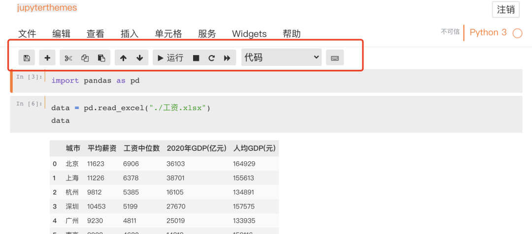 打开工具栏和打开notebook名称,下图中红色框部分。