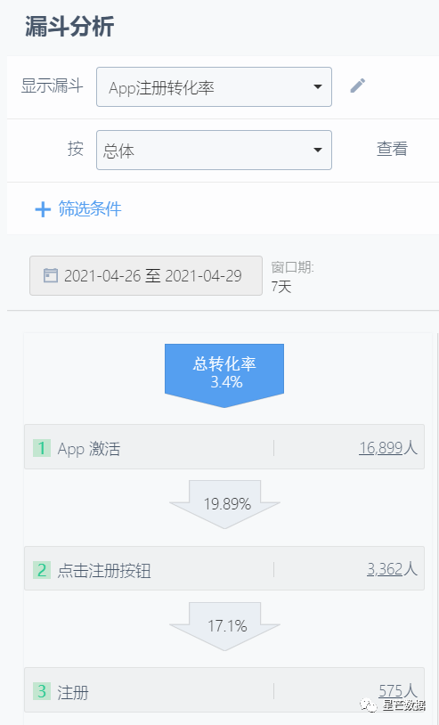 漏斗分析最常用的是转化率和流失率两个互补型指标,流失率=1-转化率。用一个简单的例子来说明,假如有16899人访问某APP,有3362人点击注册,有575人注册成功。这个过程共有三步,第一步到第二步的转化率为19.89%,流失率为80.11%,第二步到第三步转化率为17.1%,流失率82.9%;整个过程的转化率为3.4%,流失率为96.6%。该模型就是经典的漏斗分析模型。
