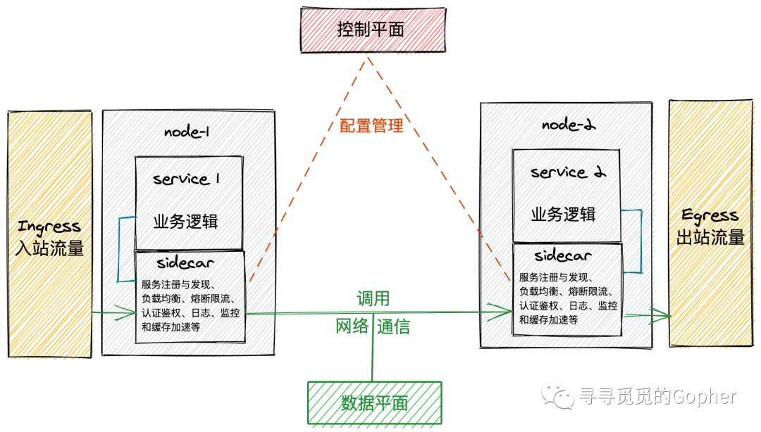 Sidecar 只负责网络通信。还需要有个组件来统一管理所有sidecar的配置。在Service Mesh中,负责配置管理的部分叫控制平面(control plane),负责网络通信的部分叫数据平面(data plane)。数据平面和控制平面构成了Service Mesh的基本架构。如图:
