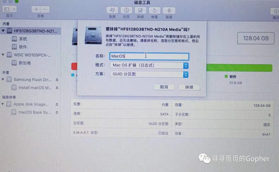 这里按照你的需要,自行抹掉分区,我这里是不要win10了,所以整块固态盘抹掉了,格式为Mac OS扩展(日志式),方案为 GUID分区图