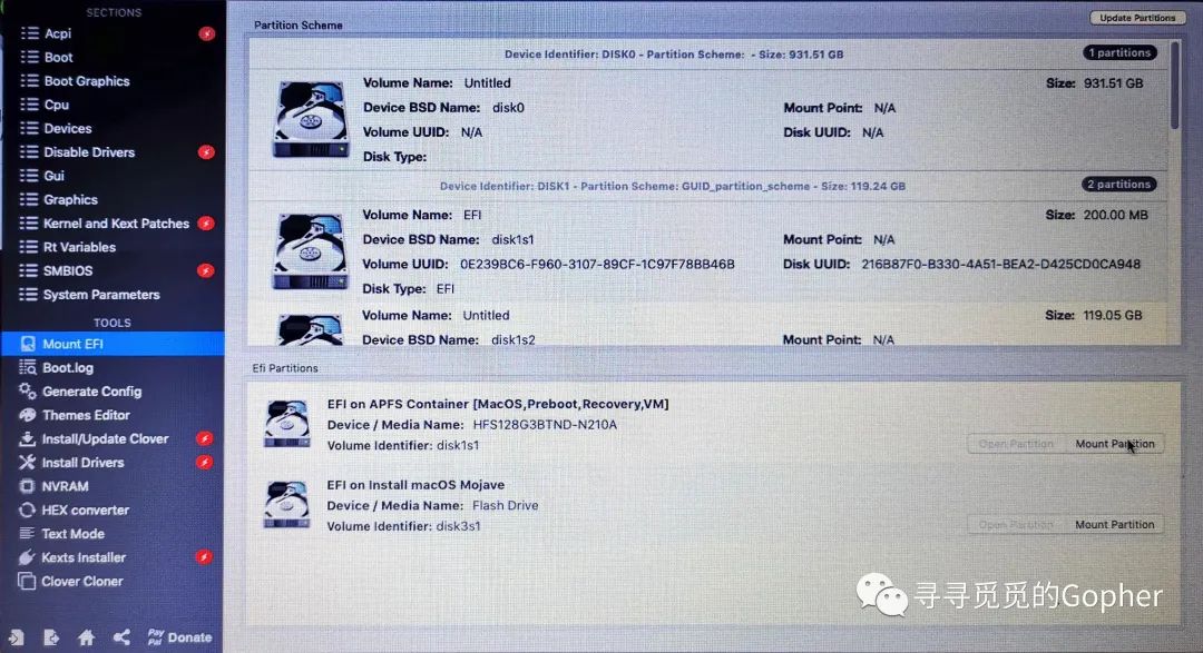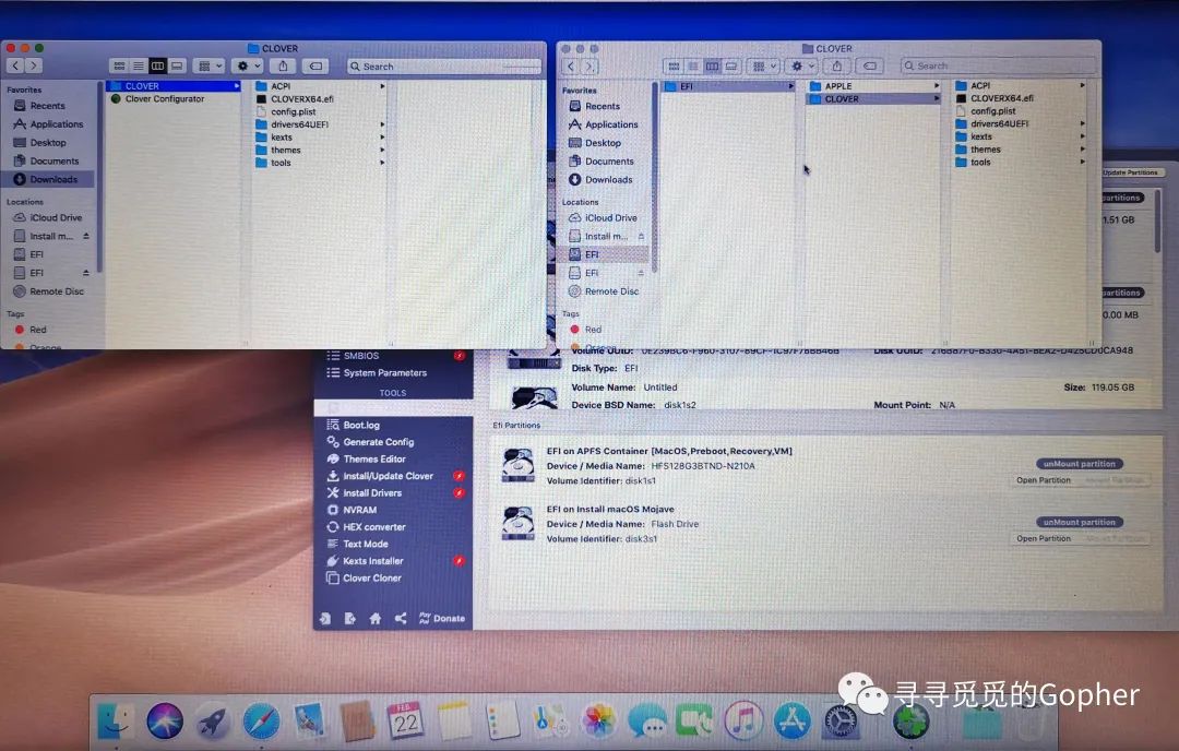 设置完毕后,就可以通过连接网线(WiFi不可用)、蓝牙共享网络、U盘等形式,将适用于本机的CLOVER和四叶草工具Clover Configurator拷贝到磁盘