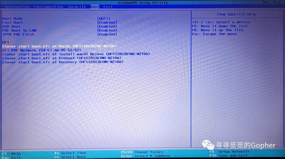 完成后,关机,拔下U盘,F2进入BIOS,调整UEFI的启动顺序,将 Cloverstart boot.efi atMacOS