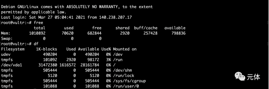 我也是这匆匆寻觅的行客之一,我在Unbuntu和Debian之间徘徊权衡的很久。最终,我选择了Debian,不为别的,就是因为经过比较,在相同的硬件资源下,Debian操作系统自身所占用的资源更少,能够留给用户更多资源运行应用。下面是在vultr云上,两个完全相同资源配置的虚拟主机,各自最小化安装Unbuntu和Debian后的资源比较: