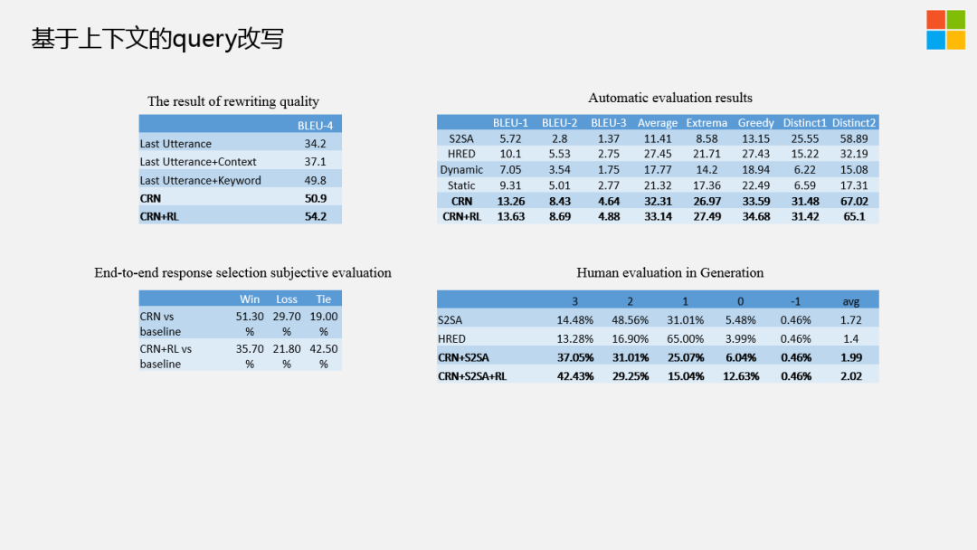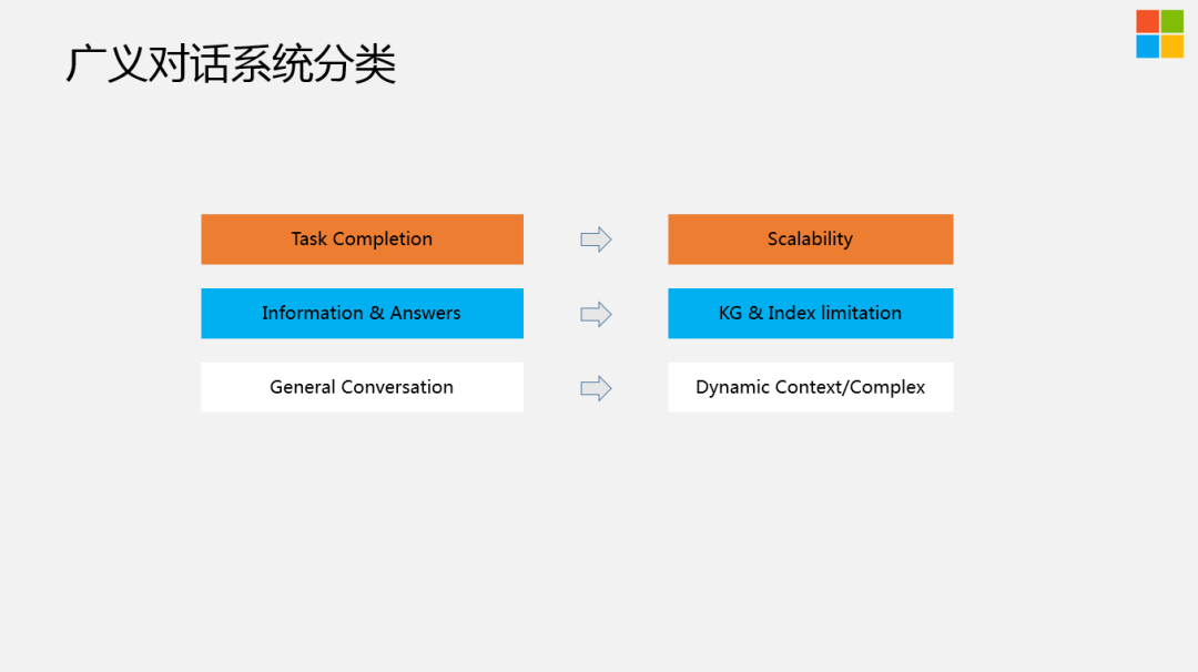 第三个方向是General Conversation ( 闲聊 ),也是小冰主要关注的方向。而这里比较大的问题是 ( Dynamic Context/Complex ) 长程的上下文非常的复杂,不仅仅是当前对话轮中会存在特别多的问题,包括用户昨天说过的话,一个月之前说过的话,可能都会对今天的对话内容造成比较大的影响,这是一个非常难的问题。
