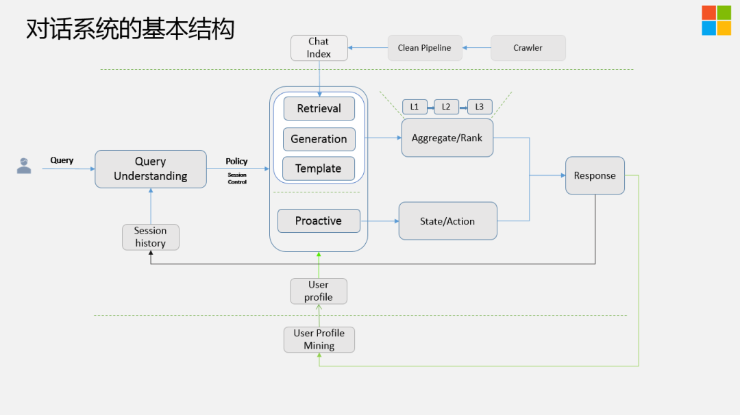 主动式的 ( Proactive ):指抛出新的话题。对话系统不是一个简单的NLP问题,它还是一个非常复杂的系统工程,需要在没话题聊的时候,尽可能的把问题弄回来或者抛出新的话题。需要维护State,以及下一步的Action应该怎样去take。