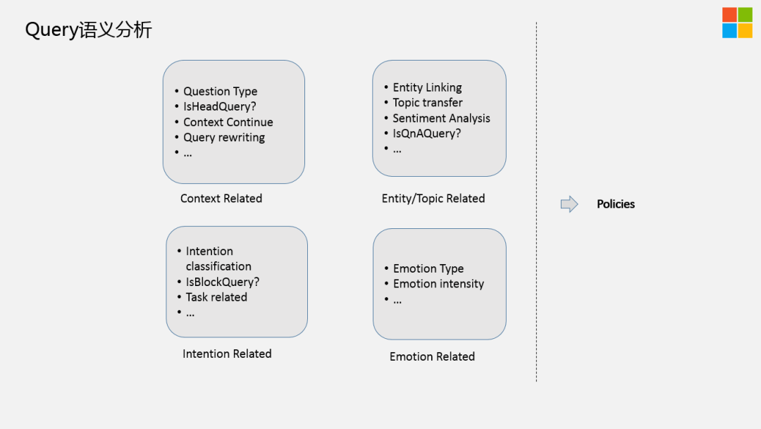 理论上这两个模块是并行跑的,当系统负载比较高时,它只走其中的一个分支。当Response ( 回复 ) 之后,我们会把它放到离线的用户画像挖掘模块。刚才我们提到,通过问用户有没有男朋友,来Mining出用户画像,用户画像又会反过来给到Ranking、Proactive非常多的信号来做进一步的决策,最后Response会回到Session模块中。刚才提到当一个Query来了之后,第一步是做Query Understanding,在我们内部有四类信号:上下文相关的,Entity ( 实体 ) 相关的,意图相关的,情绪相关的,因为我们是一个对话机器人,需要特别的关注用户当前的状态。上下文相关的信号:包括query改写,上下文,是不是头部Query,是不是在聊,以及当前的Query类型,是简单的问题,还是复杂的问题。
