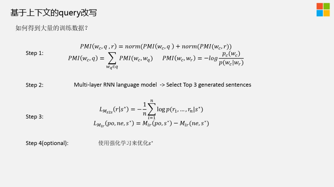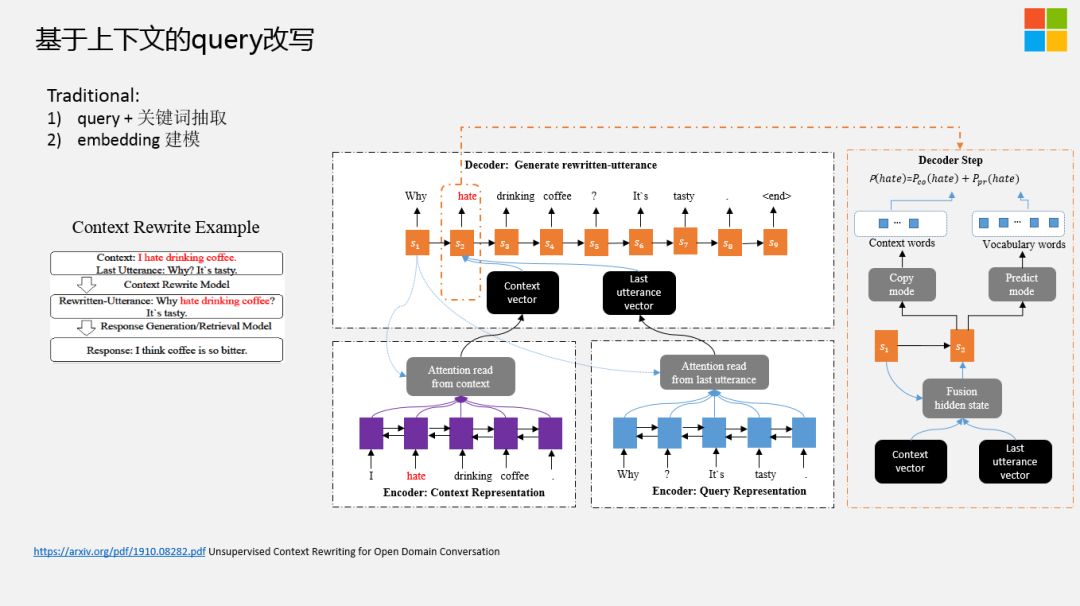 ① 针对当前的query,把上下文的key word抽取出来,和当前的query做一个combine,combine可以放在前边、后边、中间,可以按照不同的方法组合出来。② 通过sequence建模的方式,把上下文query放到统一的model中建模,得到vector,甚至可以叠加一个Hierarchical层,把整个句子的Embedding表示出来。对于①:由于生成模型会对序列产生很大影响,直接插入关键词是不科学的做法,比较简单粗暴;仅仅进行关键词抽取,可能会忽略掉一些信息,比如“否定”类的信息,就不会被挖掘到。对于②:Embedding建模的方式是一个系统工程,需要的计算资源非常大;如果整个句子过长,则起不到很好的建模作用。Unsupervised Context Rewriting for Open Domain Conversationhttps://arxiv.org/abs/1910.08282我们通过生成的方式来做Query改写,尽可能的补全当前的Query,采用2个Encoder+1个Decoder,其中一个Encoder会把Session中比较重要的信息通过Attention方式进行统一建模,同理,Query这块也是类似的处理,然后Decoder这块儿,我们会通过端到端的方式看当前生成的term是从Query端做拷贝。对于这个Task,难点在于如何得到大量的训练数据。在互联网上,有大量的长片段的Session对话,但是你要把这种端到端的 ( 给定的Context跟当前的Query ) 改写好的response很好的抽出来,但是,数据量还不是特别大。除了一些ground truth data让标注团队去标注一部分数据集,我们想端到端通过生成的方式做Query改写,还是需要大量的数据。我们的做法,分为以下几步:Step1:首先使用 Pointwise Mutual Information ( PMI ) 算法根据Query和 response ( 回复的句子 ),抽取上下文中与其共现概率最大的若干词作为关键信息。