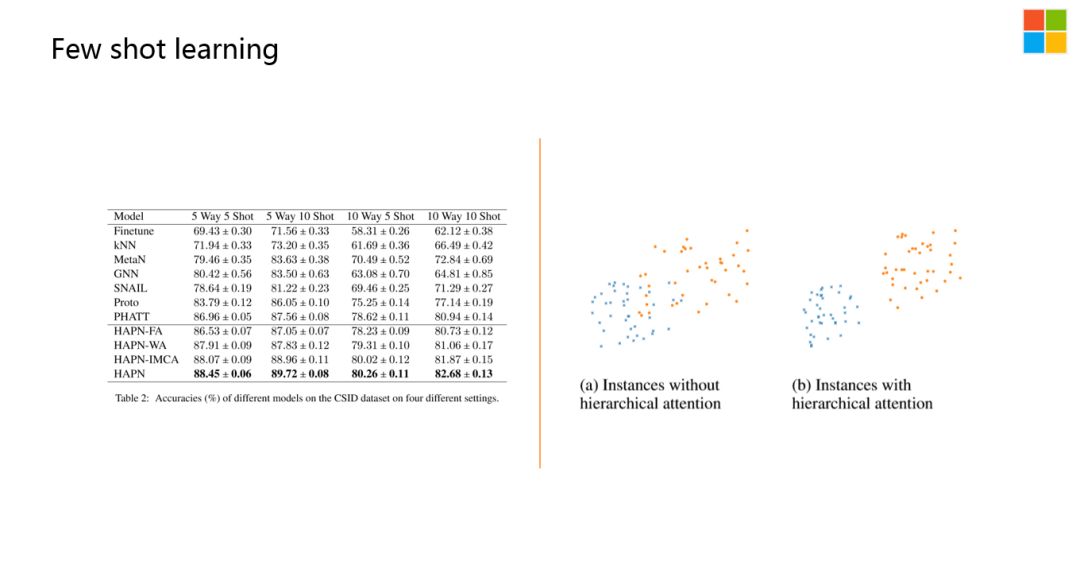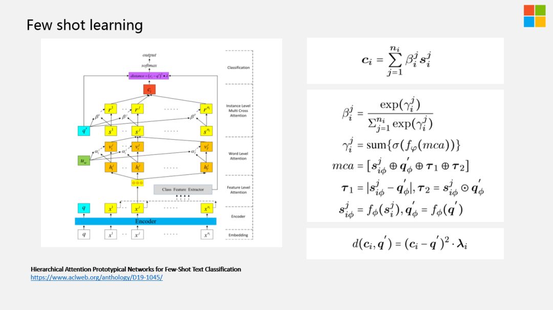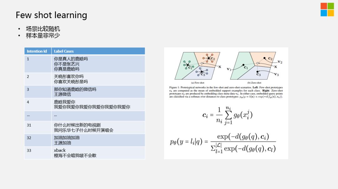 我们来看下,基于上下文的query改写结果,不管是人工评判,还是自动评判,都有比较好的结果。简单提一下,如图中左下角,我们用改写好的框架运行在实际的线上系统,端到端的衡量改写的Query,我们发现不做强化学习的模块,要高于baseline20个点,但是加入强化学习后的结果不是特别的多。我们再细致的看右边标注的结果,就是-1,0,1,2,3,其中1,2,3相对来讲是比较好的回复,大家可以看到0的比例会显着高于baseline也会高于不加LR的模块。在实际中,我们采用的是CRN的方法。在我们的对话系统中会有很多的意图,与task不同点在于task的query表达相对清晰、句式结构以及用词相对明确,但在对话系统中我们会发现有很多的Query潜在的意图可能是一样的,甚至有些Intention可能还没有Entity,场景比较随机。另外,我们能得到的样本其实非常少的,特别是小意图,基本上还是通过人工标注的方式来得到训练数据。在小样本学习中,有一个比较经典的领域,就是Meta Learning,Meta Learning又分为:基于model based方法,metric based方法。基于Metric based中又有一种方法是基于原型的网络。简单解释下原型网络:假设,现在的样本比较少,我们可以通过原型网络来建模。由于每一类都有一些小样本,在建模过程中,每一次都是随机的挑一些类别,每一类中也尽可能的挑一些样本出来,然后通过原型网络进行建模。每一个样本我们挑出来之后,都会得到一个表达,经过多次的训练,就会得到每个样本的不同表达。然后对某一类中,所有的样本做平均:我们认为C1 ( 见上图 ) 是对应的类的中心点,同样C2,C3也是各自对应的类的中心点。当一个新的Query来了之后,我们会对新的Query也进行建模,得到一个表达X,当前的X跟已有类别的distance,可以通过下面的方式,进行衡量:然后进行归一化操作得到概率,即x属于每一个类的概率。这样做有一个好处:当有新的类别加进来之后,整个模型并不需要进行特别多的改动,对于这种比较随机的场景,每天可能新增十几种新的意图,但是增加一个新的意图,并不需要再显示的重新训练模型。因为原型网络这种方式,已经在帮你尽可能的对样本做很好的建模。所以在实际系统中,我们基本上能做到20分钟以内,只要把意图构建好之后,就能把整个model重新推上线,非常的快。我们发现,Ci是根据样本的个数来做均等的分配,我们认为这不是一个特别好的思路。所以说我们做了Hierarchical Attention,这样的原型网络。具体细节大家可以看论文:Hierarchical Attention Prototypical Networks for Few-Shot Text Classificationhttps://www.aclweb.org/anthology/D19-1045/在这里,我们认为样本空间中的每一个样本对中心点的贡献都是不一样的。所以我们会有一个βij的表达,通过中间的Word Level Attention以及Instance Level Multi Cross Attention尽可能分出来每个样本对中心点Contribution。最后用当前的Query,类似的,通过Encoder layer得到q'。每个样本Ci的表达,用上面新的表达来进行更新,对每一类的标签,也会有一个新的Class Feature Extractor,也就是新的向量的表达。因为样本本身也是分布不均匀的,所以λi也是需要做建模的。