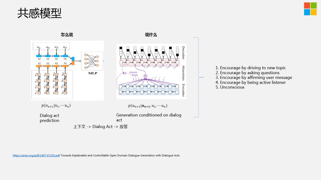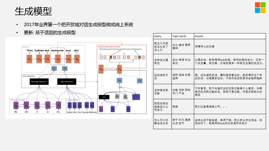 我们对结果做了一个降维的分析,发现正如我们所理解的那样:有一些样本点,比较难分的一个原因是它的用词和句式跟另外一个类别中的表达,相对来讲是比较像的。通过这种更深层次的建模,每一类中的每一个样本,对样本中心点的贡献都会不一样,把那些不太重要的样本筛掉之后,处在边界的样本会拉得更开一些。刚才介绍的两个工作都是在Query端做的工作。接下来介绍下Aggregation Ranking。L1,Inverted Index ( 倒排索引 )。我们内部也在做ANN search,尽可能的把当前的Query和Session向量化,再通过ANN的方法,做一个比较粗的大规模的召回。L2,Ranking ( 排序 )。整体分四类Feature:2018年,预训练技术开始大规模的应用。我们把谷歌的Bert技术用到对话系统中做Ranking,上线后的效果非常好。由于Bert是基于Transformer它的速度相对来说较慢,需要进行大量的模型压缩和蒸馏等相关工作。L3,Post Process进行Filter/Modify ( 过滤和调整 )。如时间调整,profile entailment ( 性别、星座、位置等 ),字符调整等操作,将不该出现的Response去掉。在2017年,我们的开放域对话系统生成模型就已经上线,甚至包括基于语音的交互系统中。最近我们会有一个基于话题 ( 也包括情绪、知识等 ) 生成的模型,在内部已经取得了比较直观的效果,但是整个模型结构可能会不太一样。我们在做生成时,尽可能把一些Topic words加进去。Topic words的来源有很多的方法。这篇论文是通过LDA的方式,还有很多其它的方法,比如LDA+Topic Graph+Knowledge Graph等,受限于篇幅,这里不再展开。Topic在生成时,会作为Decoder生成的Context其中的一部分。以前Encoder部分,可能有很多的隐藏状态,会对它进行Attention,这时,我们也把基于topic的表达也放到context中,不仅能看到Message Attention,也能看到Topic Attention。实际的效果,见右图。我们给美妆护肤领域做的Chatbot,一个定制化的生成模型,效果还是不错的。在做垂域的对话系统时,我们并没有很多质量比较高的数据。所以我们是在一个比较大的数据集中,端到端来做的,然后选择系统中具有代表性的term做生成。在Long Tial问题中,这种端到端的方法效果是非常好的。从系统整体的对话结构上来看,其实就是QA。但在QA中间,是存在一些策略的,也就是说,对当前的上下文,对用户来讲,机器人要不要引入一些新的话题。整个对话相当于是商检的过程,因为对话本身是无序的,如果回答的不好,就会东扯一下西扯一下。从商业的角度来讲,整个系统的稳定性不是特别好,用户聊了两句可能就走了,所以需要尽可能的获取对话的节奏。那么,有没有可能更显式的控制对话的节奏?Towards Explainable and Controllable Open Domain Dialogue Generation with Dialogue Actshttps://arxiv.org/pdf/1807.07255.pdf我们引入了Dialogue Act概念,在这里,我们有比较宽泛的七大类的Act,比如我们是应该follow用户的问题,还是针对用户的问题,问一个新的问题,或者直接拒绝回答用户的问题,这是一大类。还有一大类,是发现当前的Session聊得不太好了,需要更多的引入新的话题,新的话题有可能是饭,也有可能是问题等等。通过这样的方式,我们可以比较好的建模对话的节奏。
